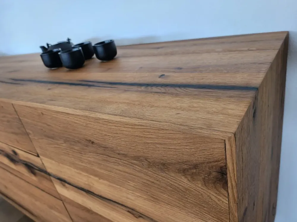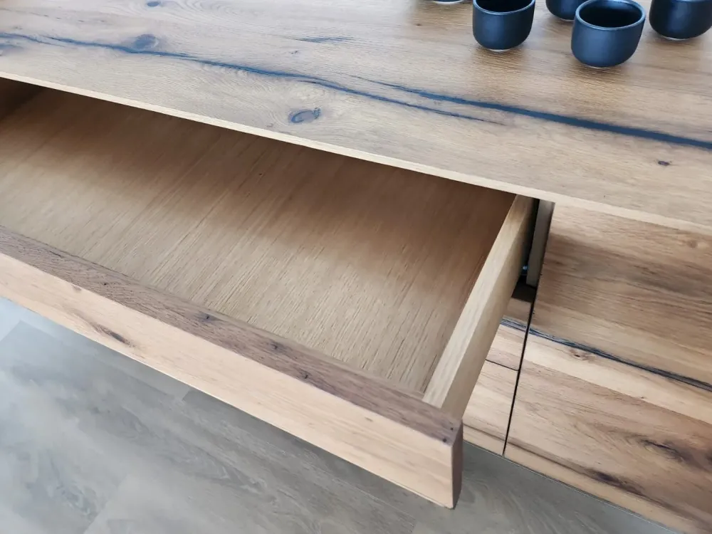 - Maniglia push-pull e posizionamento a terra: La madia M502 Tyrion è dotata di una pratica maniglia push-pull che permette di aprire e chiudere facilmente i cassetti. Inoltre, può essere posizionata direttamente a terra, senza la necessità di fissaggi a parete.