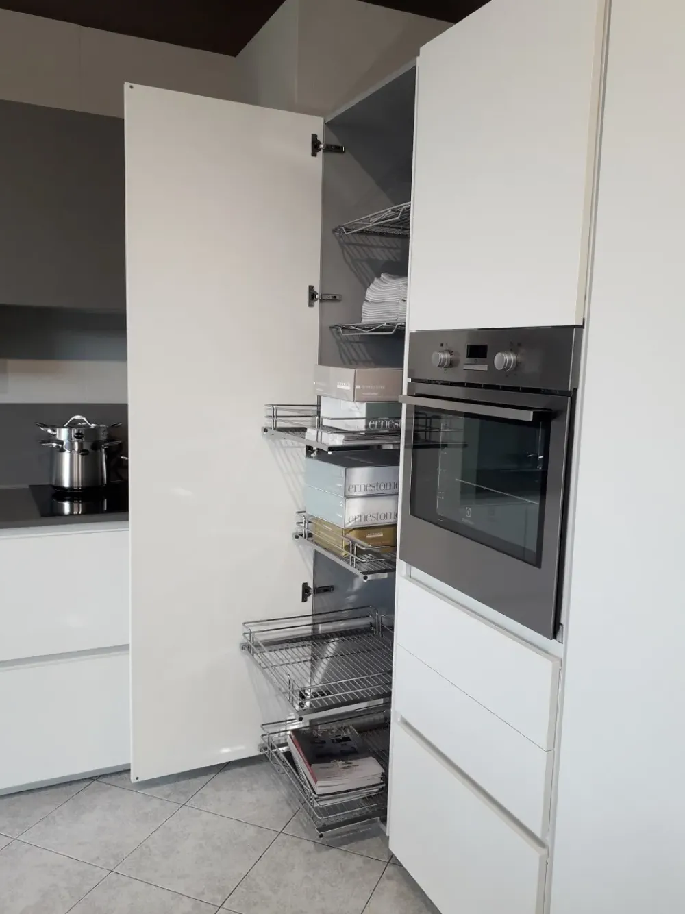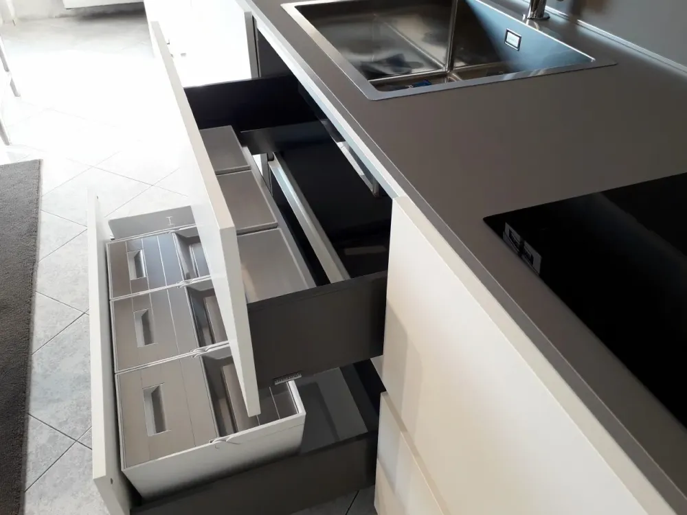 Composizione cucina con penisola scontata Ernestomeda mod. ONE80, versione FENIX Bianco Kos e Grigio Londra, con top e alzata in Fenix Grigio Londra, con vani a giorno e penisola Balance in laminato materico effetto legno tinta Brandy, con gole e zoccolo h 7 cm in finitura bianca. Dimensione: parete attrezzata lunghezza totale 390 cm, parete colonne lunghezza totale 187 cm. La composizione è completa dei seguenti elementi: penisola Balance dimensione 180 x 90 cm, base sotto la penisola da 60 cm con anta battente, base da 60 cm con anta battente, anta per lavastoviglie a scomparsa da 60 cm, base sottolavello a due cestoni da 90 cm completa di set pattumiera per raccolta differenziata, base sotto il piano cottura a due cestoni ed un cassetto interno fornito di portaposate Wengè, colonna dispensa con ripiani estraibili, colonna forno da 60 cm con un’anta, due cassetti ed un cestone, colonna frigocongelatore da 60 cm, doppia gola verticale per colonna da 3,5 cm, pensile AllInOne con illuminazione Led lunghezza 210 cm diviso internamente (vano dispensa, vano scolapiatti e vano cappa) e pensili a giorno H 18 cm. La cucina è fornita inoltre dei seguenti elettrodomestici: lavello inox con incasso semifilo serie S4001, miscelatore cromato Barazza mod. B_Free, lavastoviglie a scomparsa totale Electrolux mod. TT803R3, piano cottura ad induzione da 60 cm Electrolux mod. KTI6500E, forno inox Electrolux mod. FQ63X e frigocongelatore Electrolux mod. ENN2851AOW. Tavolo e sedie escluse, possibilità di acquisto su richiesta con prezzo da concordare in aggiunta. VENDITA PER RINNOVO ESPOSIZIONE. TRASPORTO E MONTAGGIO ESCLUSI.