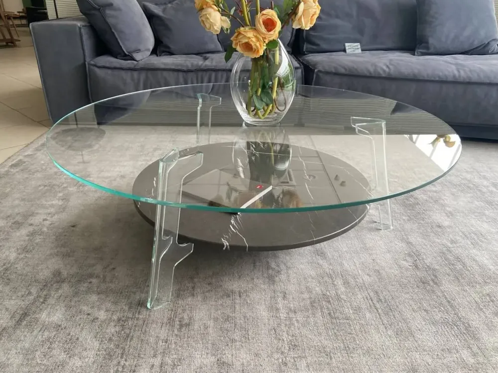 Tavolino con top e struttura in cristallo extra-chiaro e un ripiano in marmo.