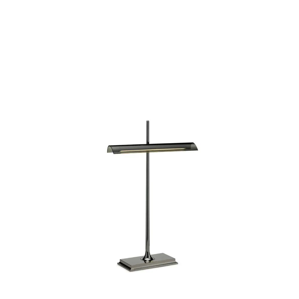 Apparecchio di illuminazione da tavolo a luce diretta. Struttura in alluminio con diffusore esterno in metacrilato trasparente e diffusore led in PC opalino. Interruttore ottico sulla base dimmerabile con tecnologia “Soft Touch”.Una presa USB posizionata sul retro della base permette la ricarica dei pi comuni smartphone e tablet (max 1,5A).L’alimentatore è su spina con plug intercambiabili. Il cavo di alimentazione è lungo 2,5 metri.