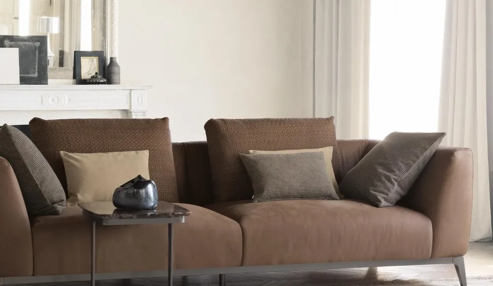 Seduta e schienali con rivestimento sfoderabile in tessuto o pelle. Arricchiscono le composizioni grandi cuscini di sostegno per schienale realizzabili con i tessuti della collezione Flou oltre che con il caratteristico rivestimento in pelle lavorata a intreccio e cuscini decorativi di varie dimensioni.