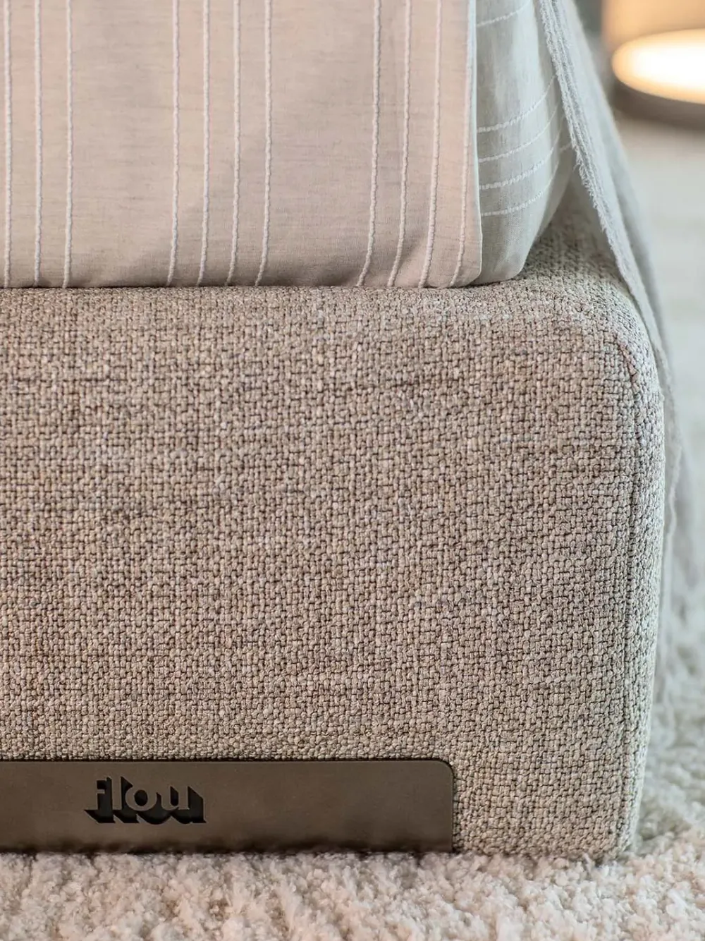 Sul profilo in metallo della base spicca il logo Flou, una etichetta che lo identifica e lo distingue.