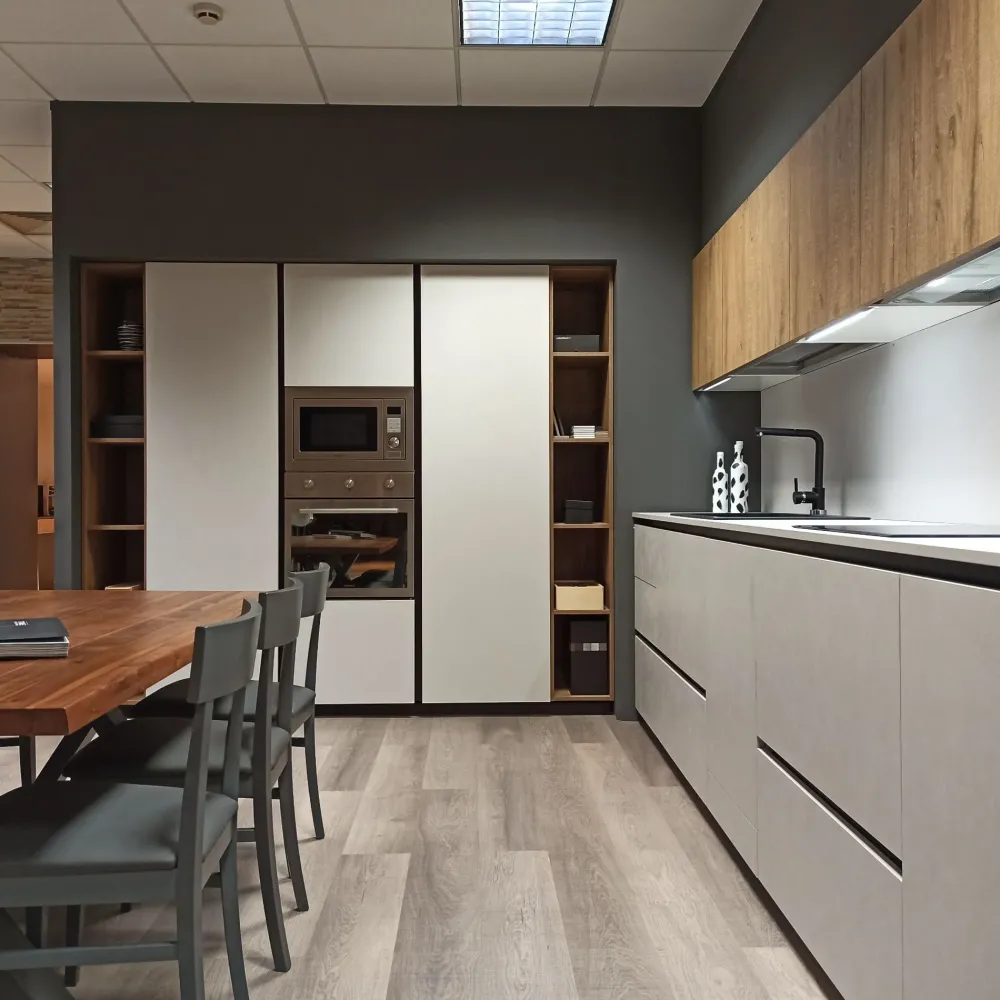 - Stile design: cucina Time con cappa a incasso, forno multifunzione, forno microonde ad incasso, frigorifero ad incasso, lavastoviglie a scomparsa, lavello fragranite, piano cottura induzione, top cucina HPL.