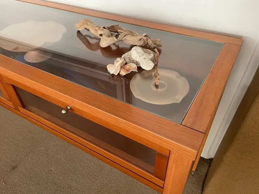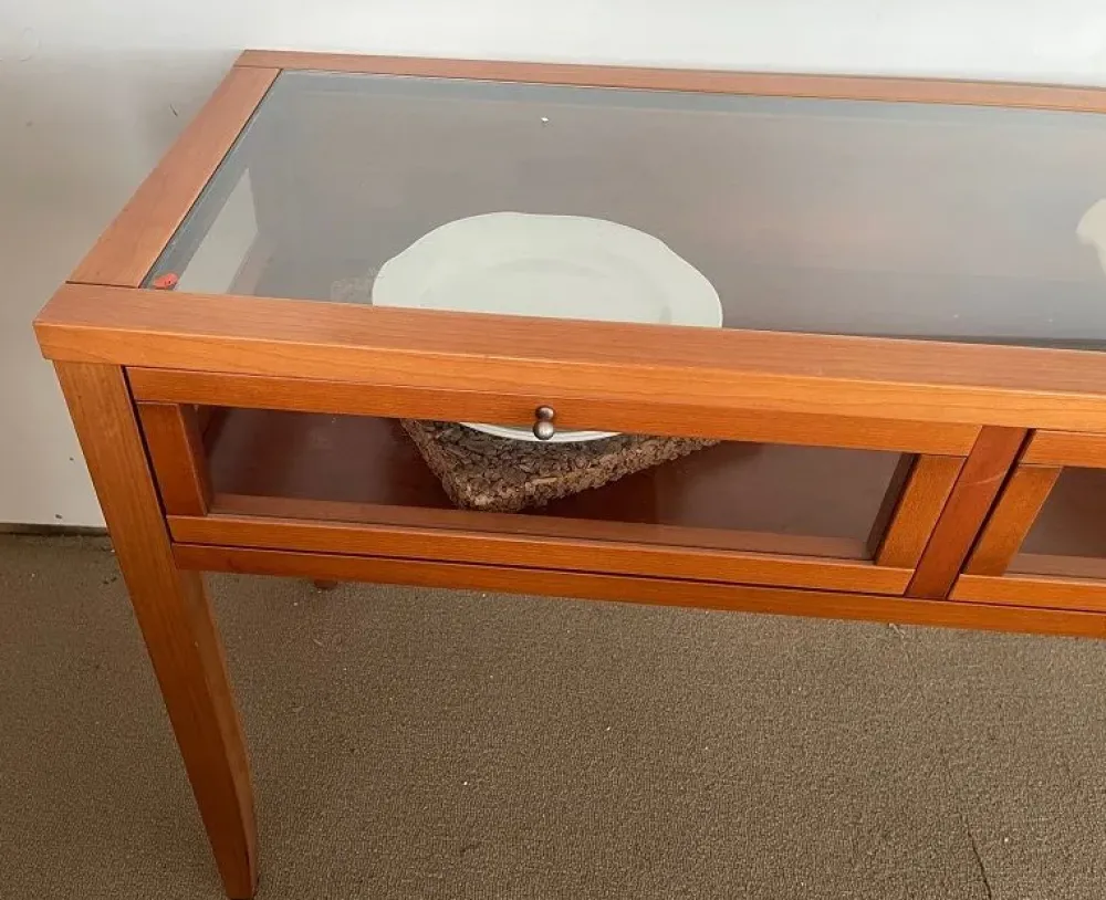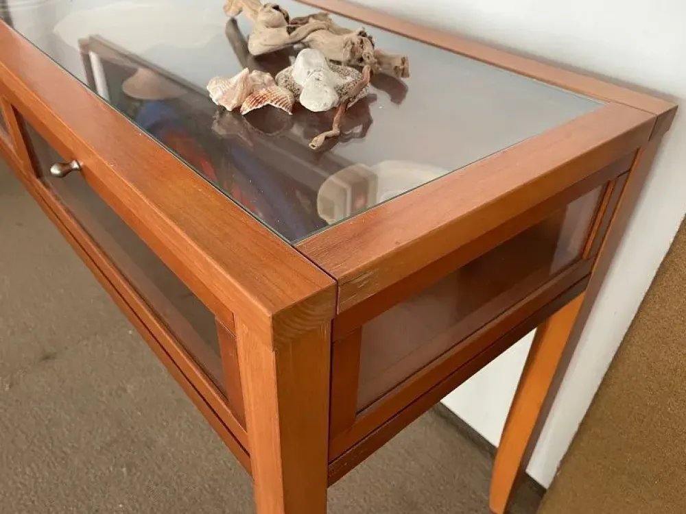 MOBILE IN CILIEGIO HALIFAX CON PIANO SUPERIORE IN VETRO TRASPARENTE E ANTE IN VETRO TRASPARENTE CON POMELLI IN ACCIAIO.