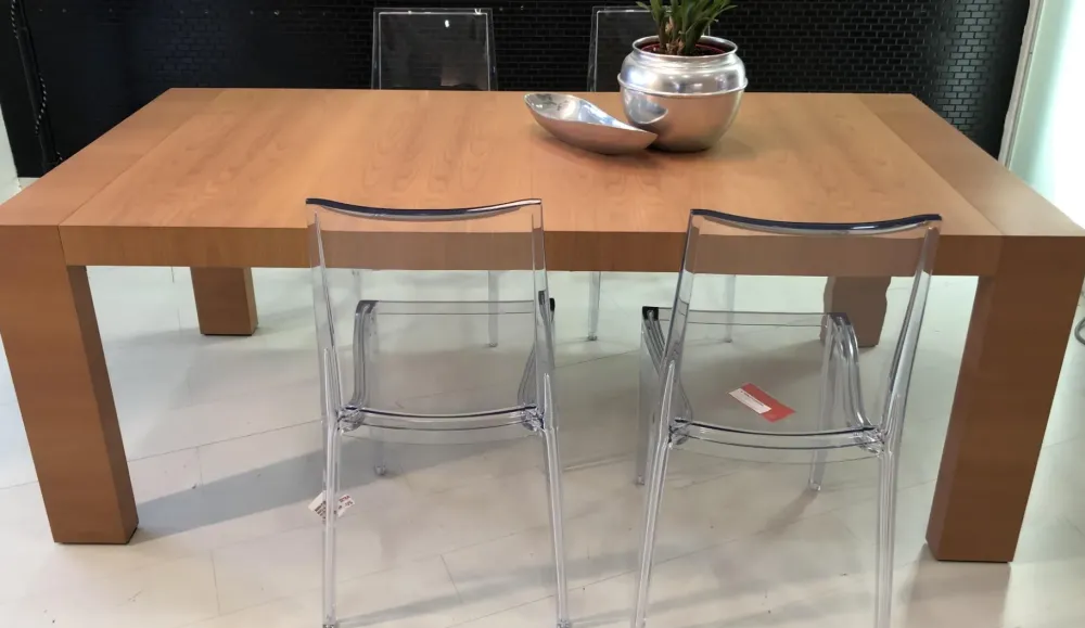 Tavolo Dante rettangolare fisso, con gambe a ponte piegate a folding in essenza ciliegio naturale. Dimensioni: cm L. 200 x H. 73 x P. 95