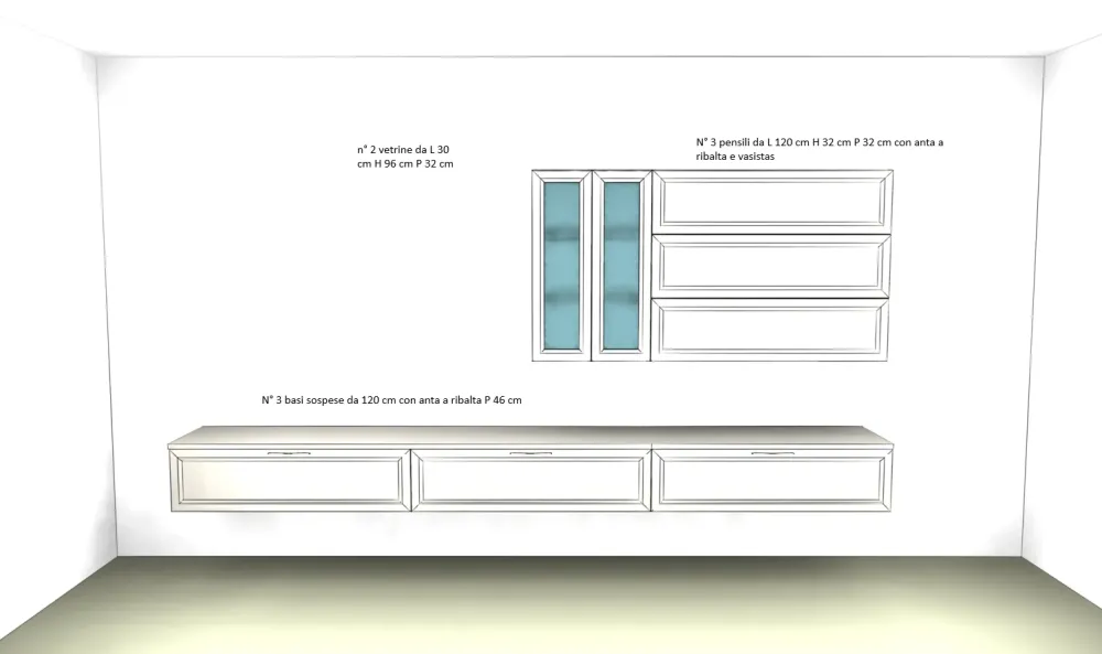 Il soggiorno si compone di un mobile TV da L 360 CM H 200 CM P 46 CM (l’altezza è variabaile in base al montaggio) che include tre basi sospese da 120 cm con anta a ribalta e tre pensili da L 120 CM H 32 CM P 32 CM con anta a ribalta e vasistas, oltre due vetrine da l 30 cm h 96 cm p 32 cm.