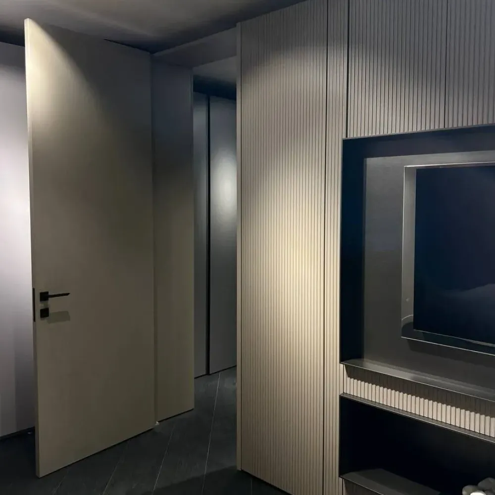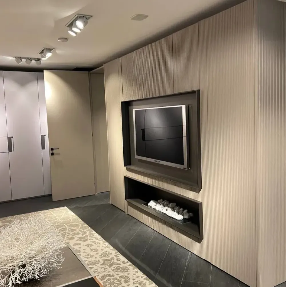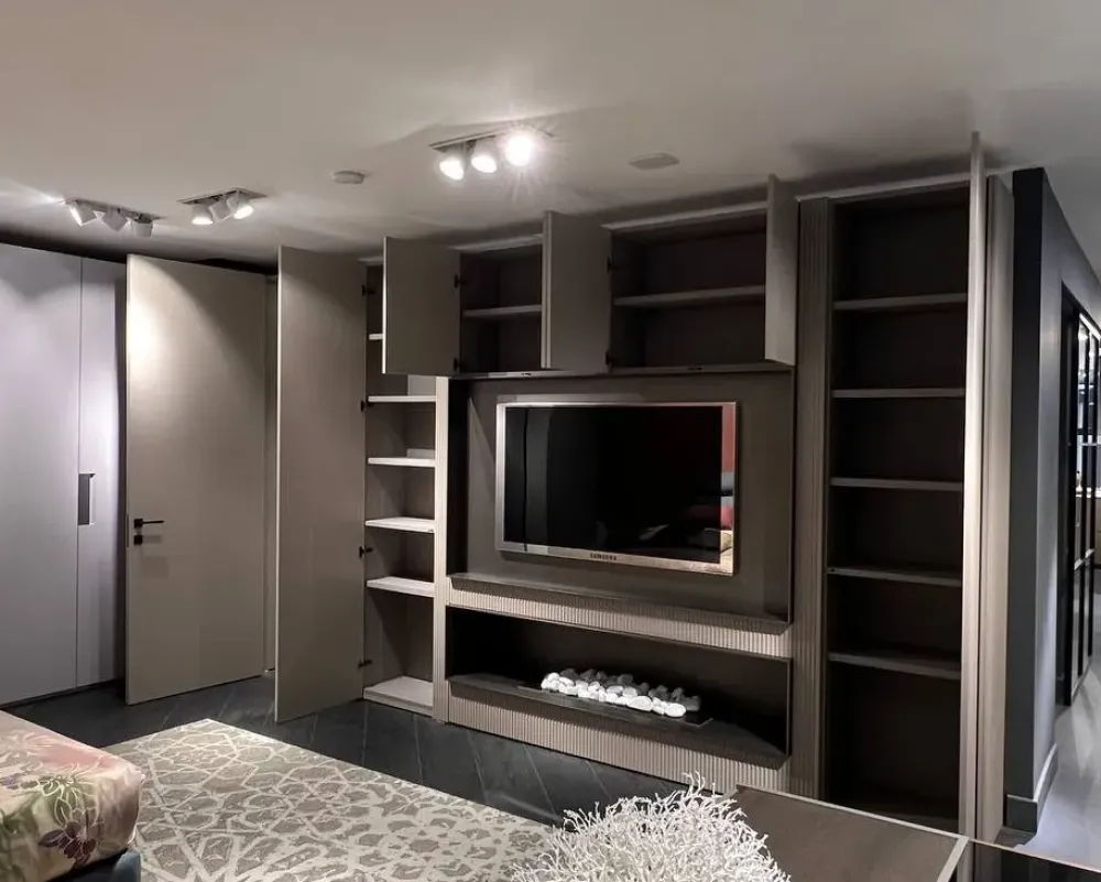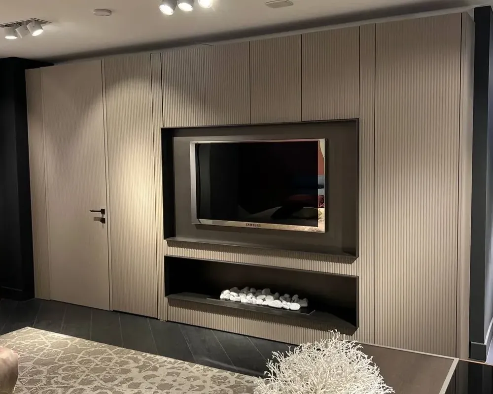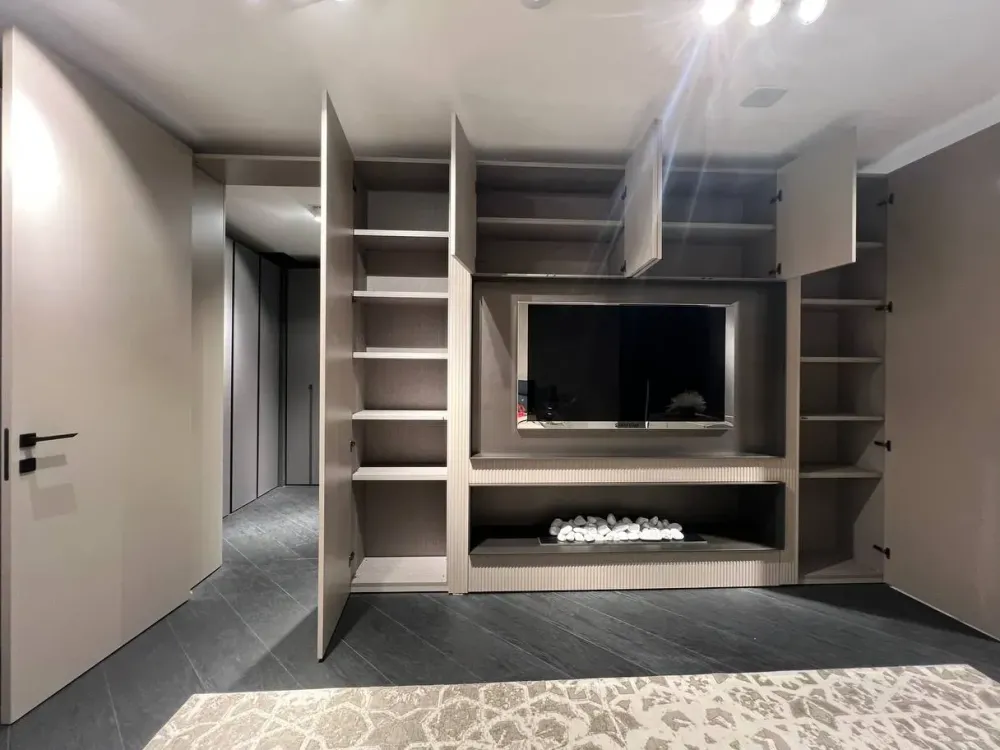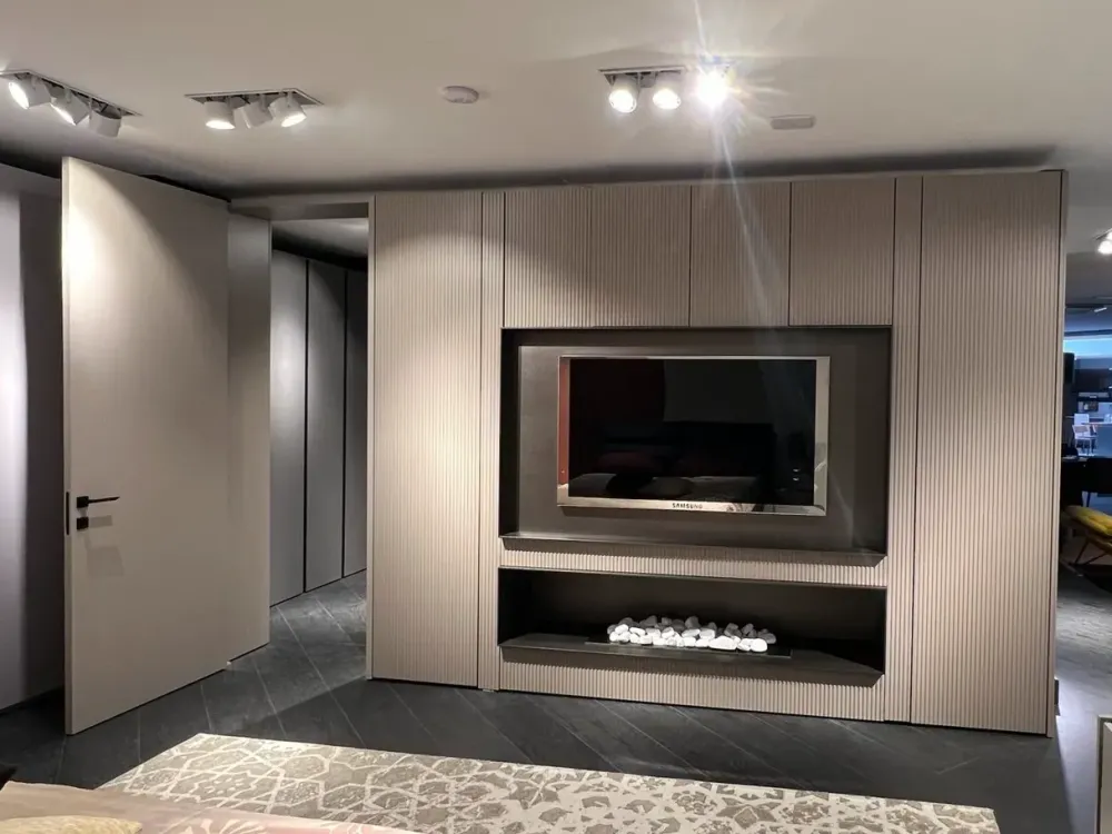 box tv e camino in laccato metallico bronzo, porta battente con maniglia e retro con boiserie verticale.