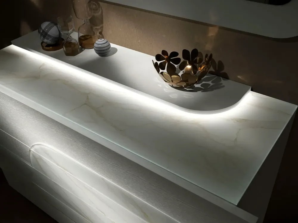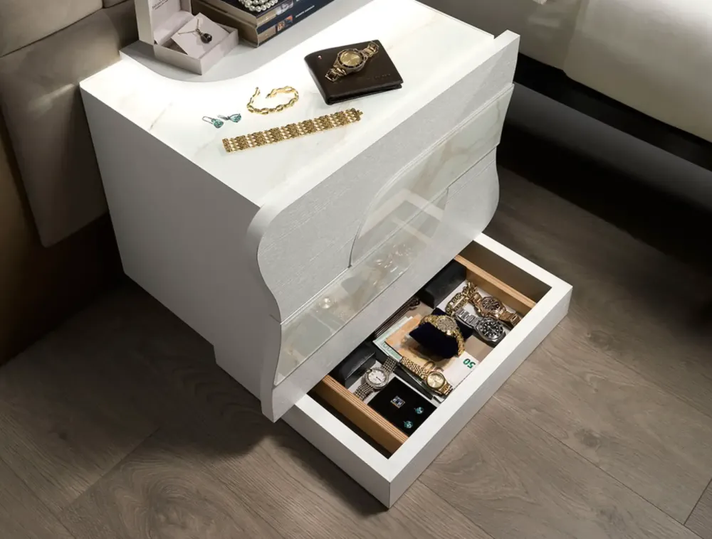 Letto con contenitore rivestito in velluto, armadio scorrevole con inserti in spechio bronzo, comò e comodini con piana in vetro effetto marmo, luci led e zoccolo portagioie.