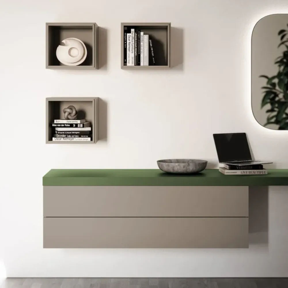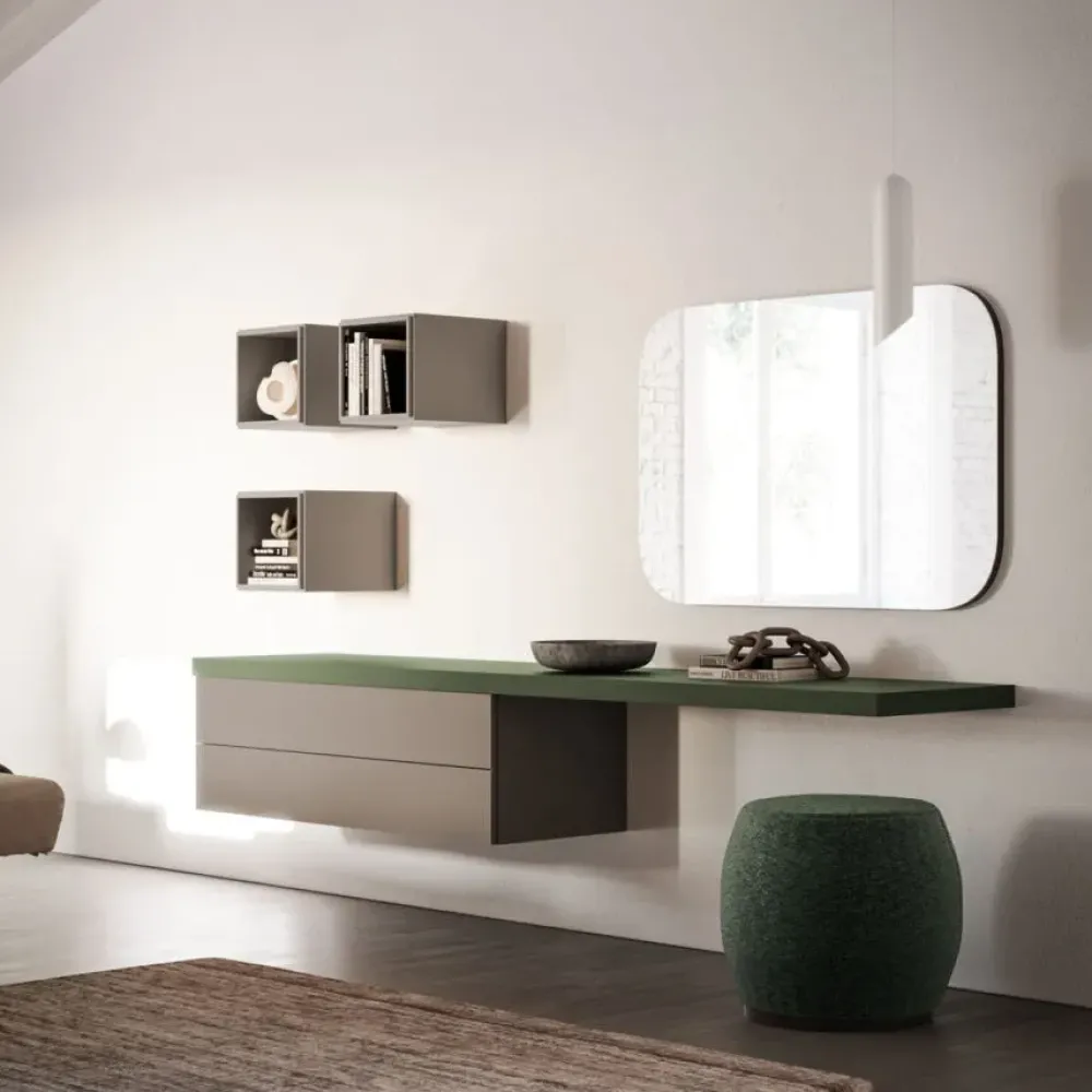 Elementi: Comodino sospeso Compongo in laccato opaco Ecrù, tavolino Ginestra in metallo brunito con top in vetro martellato Ecrù. Consolle in laccato opaco Pino con elementi Compongo in laccato opaco Ecrù. Specchio Soul.
