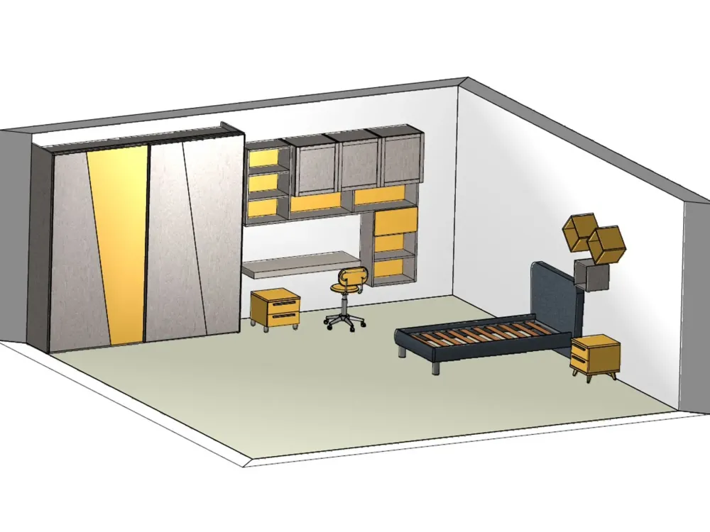 CAMERETTA COLOMBINI MODELLO GOLF C118 colori rovere Dorian e giallo zafferano. La cameretta in promozione è composta da: – armadio a due ante scorrevoli (dim. L. 270 x P. 58 x H. 257,6 cm) con l’anta con taglio diagonale in colore giallo zafferano, nell’armadio ci sono due ripiani e quattro tubolari appendiabiti; – parete attrezzata sopra la scrivania che ha un ingombro massimo di L. 245 cm, tutta la struttura è di colore rovere dorian con schienale e anta push and pull di colore giallo zafferano; – scrivania L.150 cm fissata al muro; – sedia Flea girevole con ruote di colore giallo; – cassettiera su ruote; – letto imbottito in tessuto (L.90 cm) con rete a doghe inclusa; – comodino a due cassetti su piedini; – n°3 cubolotti sopra il letto. Possibilità di pagamento personalizzato rateizzato. Possibilità di personalizzare colore e dimensioni.