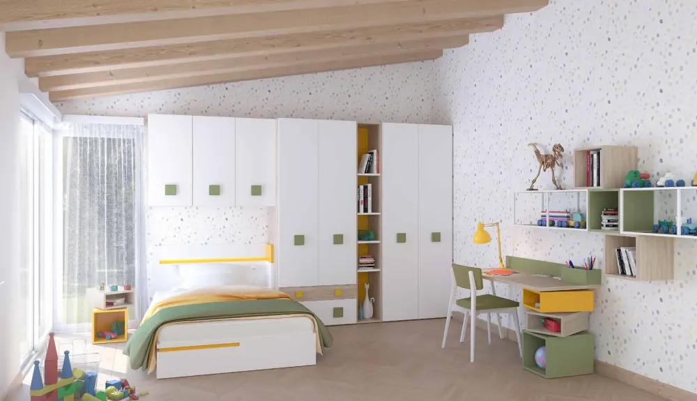 Sono molteplici le soluzioni componibili di ” LINEA IN ARREDAMENTI ” dal nuovo design e nuovi colori di finitura per arredare la cameretta e creare un ambiente accogliente e armonioso. Nell’armadio a ponte trova posto il letto di larghezza cm 120 per ottimizzare lo spazio e muoversi in libertà. E’ possibile acquistare separatamente i vari pezzi della composizione secondo le varie esigenze. E’ possibile completare/richiedere: – armadi con apertura ante scorrevole – servetto saliscendi porta abiti – cesti estraibili – specchi interni E’ possibile modificare: – misure e componibilità della composizione – finiture con colori diversi – realizzazione anche “su misura” per armadi, librerie, mensole Scheda informativa del prodotto di Qualita` MADE IN ITALY – strutture in laminato materico Classe E 1, sp.mm 18, – ante in laminato materico Classe E 1, sp. mm. 22, bordo ABS 4 lati, – struttura letto/mensole in laminato materico Classe E 1, sp. mm.30 bordo ABS 4 lati, – ripiani interni spostabili – maniglie: finitura: verde – finiture colori: olmo light, bianco, giallo ocra, verde. LA COMPOSIZIONE COME FOTO COMPRENEDE: Armadio ponte con 7 ante ad apertura battente + libreria con vani a giorno completo di: – 4 tubi inox portabiti – 4 ripiani – misure: L. cm 342 x P. 58 x H. 225 Letto – rete, struttura in metallo verniciato a fuoco, pianale con doghe in legno – misure: L. cm 120 x P. 200 – materasso escluso. Comodino – misure: L cm 32 x P cm 43 x H cm 52. Scrittoio – misure: L. cm 130 x P. 60 .Libreria pensile – misure: L cm 224 x P cm 32 x H cm 98. Sedia esclusa-