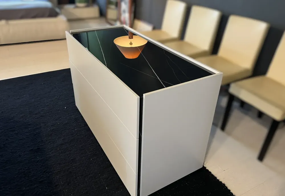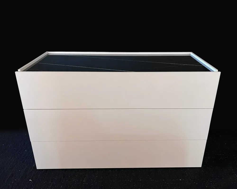 Linee essenziali e ricercate, concepite nel segno della versatilità e della praticità. I cassetti della collezione Atlante presentano frontali coordinati con la struttura e si aprono lateralmente mediante una gola rientrante che garantisce una presa comoda e intuitiva. I profili laterali verticali e il piano superiore sono in vetro lucido Sahara Noir.