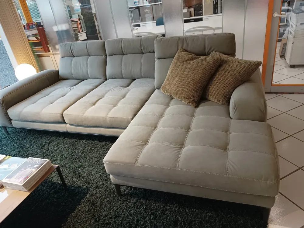 Divano composto da un elemento a 3 posti con bracciolo e penisola da cm 170 . La caratteristica principale di questo divano è lo schienale che si può posizionare in due posizioni aumentando la seduta per un maggiore relax. Il rivestimento è in pelle Storm effetto naturale col. 30070 verde salvia, completo di 2 cuscinetti in tessuto. Piede in metallo finitura bronzato 22