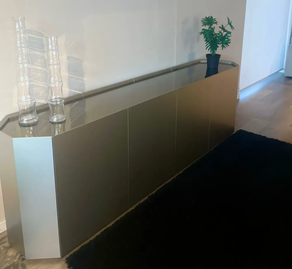 Scultorea e geometrica, Chelsea è una madia moderna di design che riesce ad integrarsi in modo armonico nell ambiente living , le sue misure sono di 248cm di lunghezza, 46cm di profondità e 75cm di altezza: la sua struttura è in titanio mentre il piano è di specchiato bronzo.
