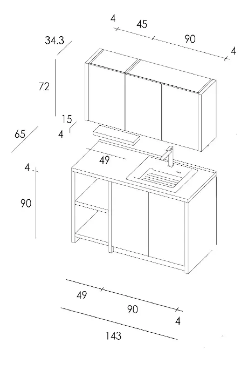 MASTELLA propone questa composizione Lanudry 14 di misure L.140 x p.65 x h.94 cm. con una base a due ante porta lavella, affiancata da un vano a giorno.