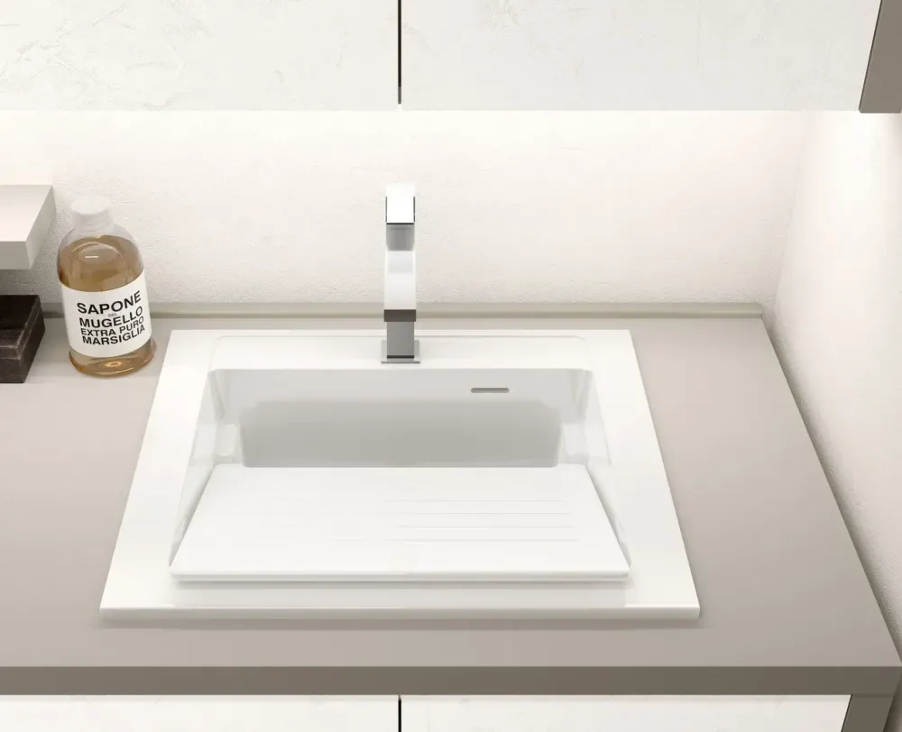 Una vera lavanderia non può mancare della zona preposta al bucato a mano, anche se in MyLaundry l’inserimento è opzionale. Se lo desideri, è disponibile il nostro lavatoio con tavoletta estraibile prodotto in mineralmarmo opaco o anche lucido. Capiente, bello esteticamente, funzionale, lo puoi utilizzare senza tavoletta o con tavoletta inclinata per il bucato a mano. Lasciando la tavoletta orizzontale il lavatoio diventerà un normale lavabo da tutti i giorni.