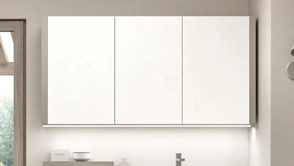 Struttura e top in HPL color Juta, con frontali in Soft Mat color Latte, come pure i pensili a tre ante e la mensola abbinata.