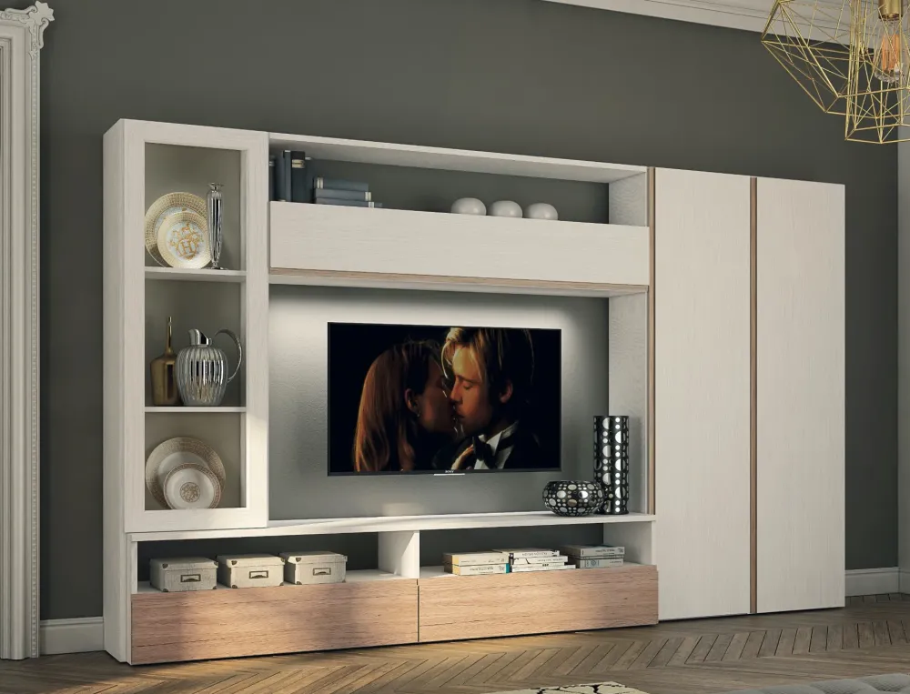 - La composizione per la zona giorno qui visibile è realizzata in materiali di prima scelta e resistenti negli anni: questo modello, in particolare, è in laminato materico.