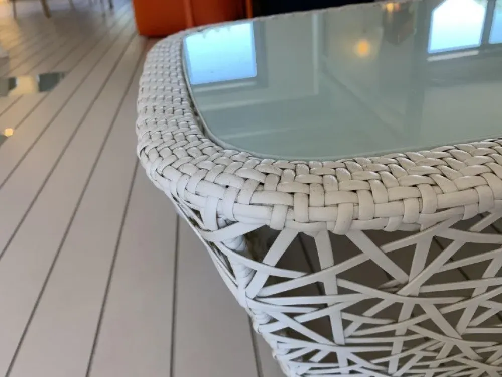 Il tavolino di Kettal è realizzato in fibra sintetica bianca con piano di appoggio in vetro bianco.