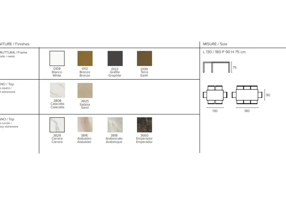 - Per il tavolo Target point Rettangolare allungabile Enea, è disponibile un piano eccellenti costruito in ceramica, appropriato per completare esteticamente spazi di ogni stile assicurandoti al contempo di avere una superficie di appoggio multifunzionale e sempre a disposizione; questo materiale di gran classe sarà capace di arricchire il tuo soggiorno o la tua cucina secondo il tuo stile personale.
