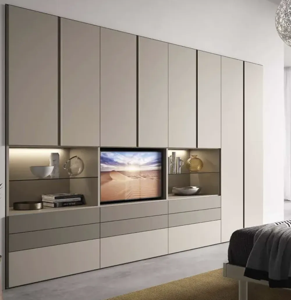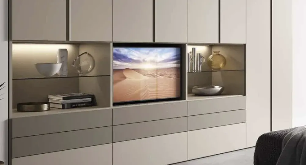 Elemento distintivo di questa composizione sono i vani a giorno a metà altezza, ideali per inserire una TV, elementi decorativi o libri, trasformando l armadio in un vero e proprio arredo living. Un dettaglio che lo rende unico, versatile e contemporaneo.