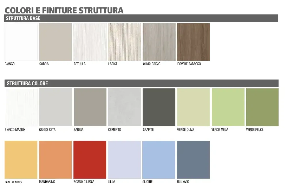 - Ante: Ampia gamma di colori, con finiture effetto legno, opache o materiche