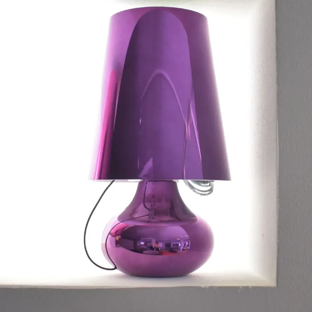 La tipica lampada da tavolo degli anni ’70, rivisitata per forma e colore. L’abat-jour Cindy, composta da un cappello conico e da una base sferica, che scende a goccia, viene proposta in un’ampia gamma di tonalità metallizzate, tutte coprenti.