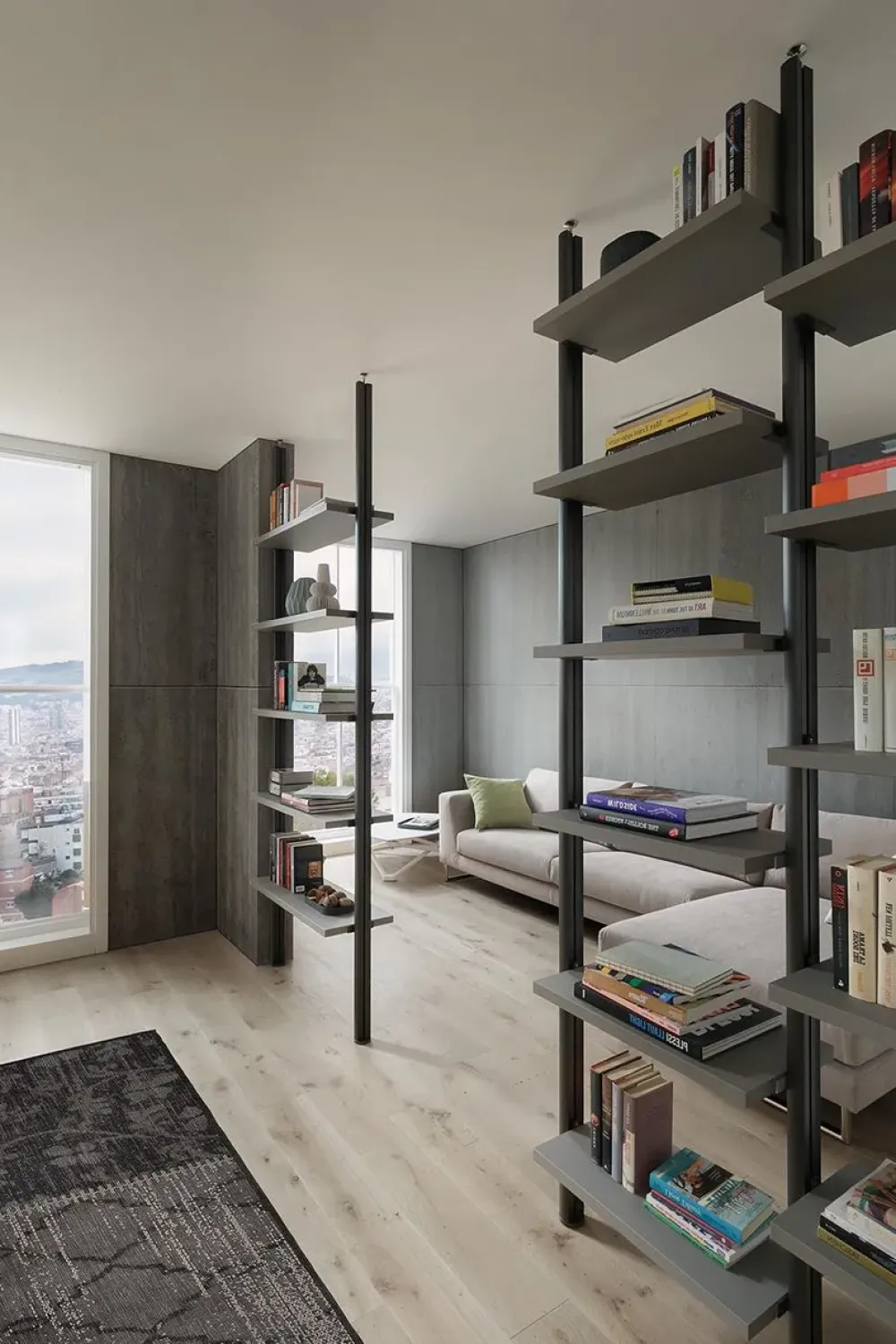 Sistema modulare basato su montanti in alluminio anodizzato o verniciato a polveri epossidiche. Mensole in truciolare rivestite in HPL o FENIX.
