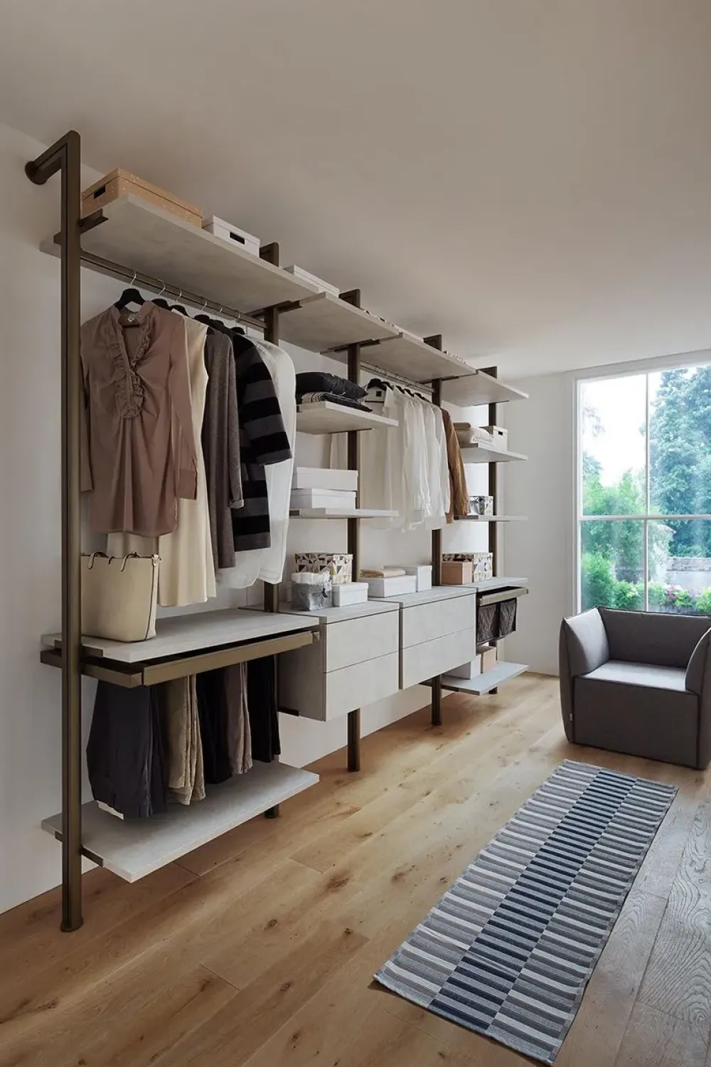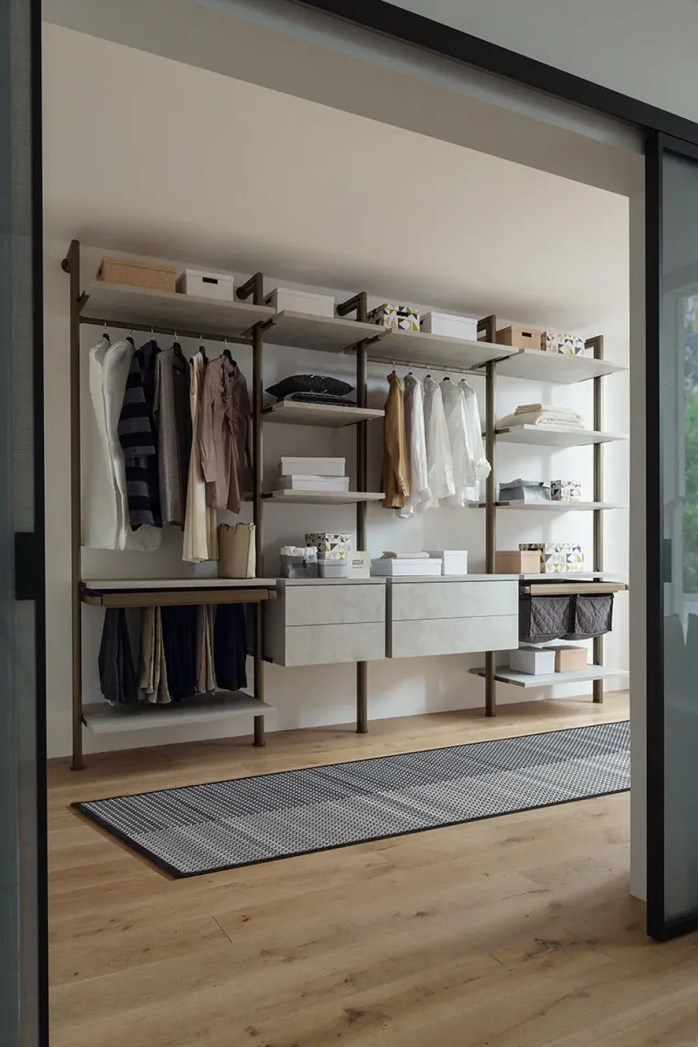 Tubo appendiabiti in alluminio. Cassettiera per cabina armadio interamente realizzata in pannelli rivestiti in HPL.