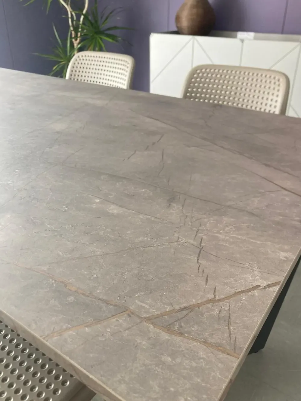 Tavolo 160×90 allungabile 238 cm, con basamento scorrevole in finitura Moka e Piano in Laminato HPL finitura Kaspio Oro.