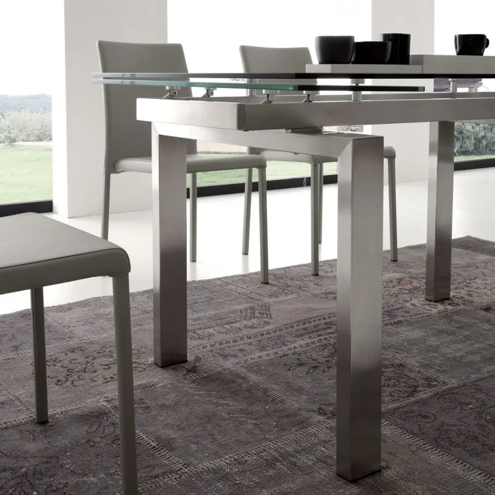 - Struttura in acciaio satinato spazzolato e vetro temperato 10 mm trasparente.
