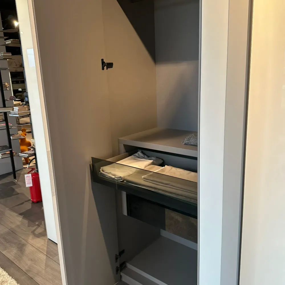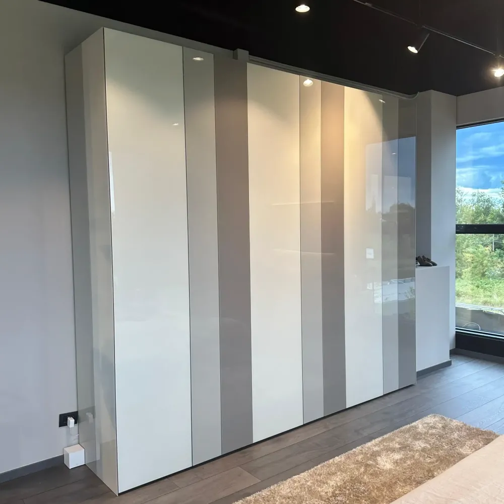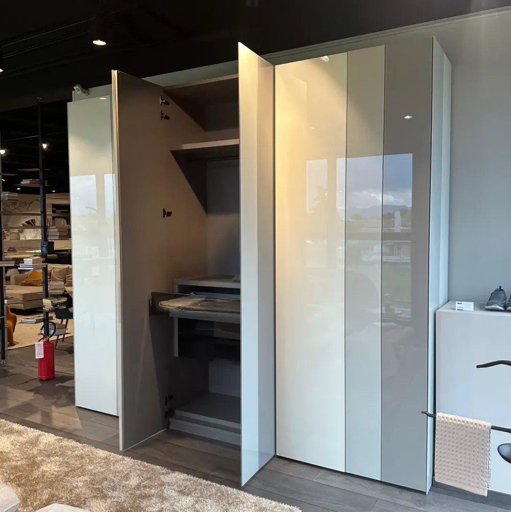 Nella nostra esposizione abbiamo scelto un armadio N.O.W. a 6 ante, caratterizzato da finiture in vetro lucido bianco, mandorla e tortora. All’interno troverete diversi ripiani in legno e una cassettiera a tre cassetti con frontali in vetro lucido fumè grigio, oltre a un pratico vassoio estraibile porta pantaloni. Questo modello è disponibile in offerta per rinnovo expo.