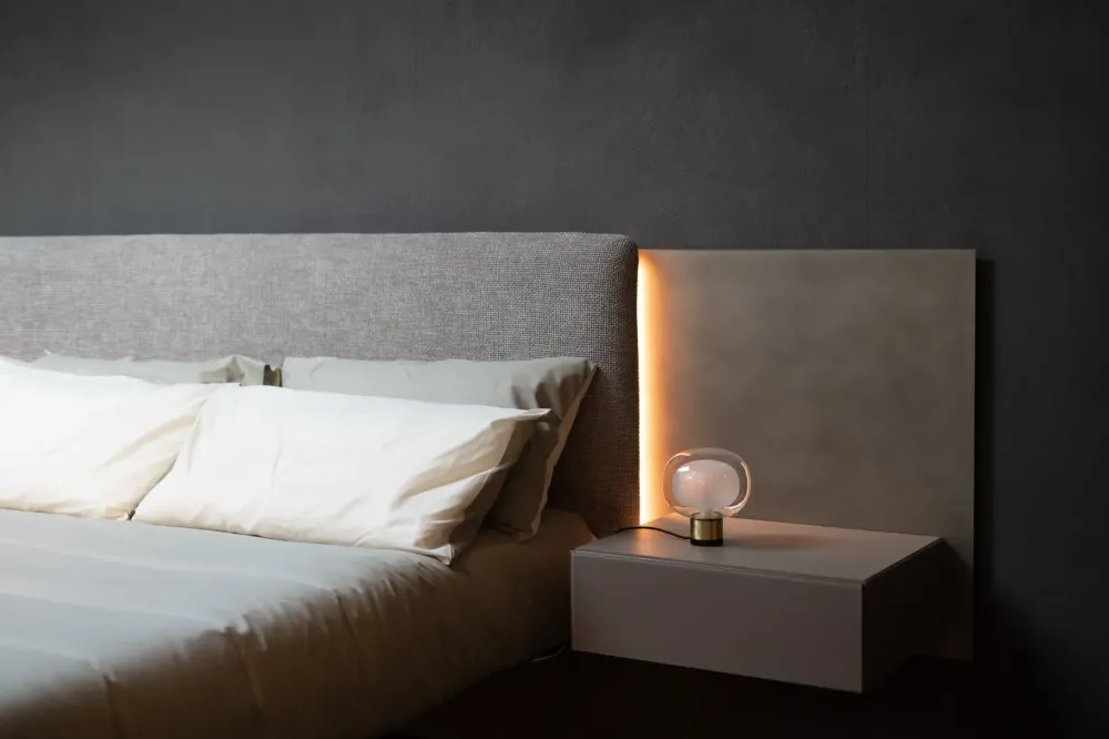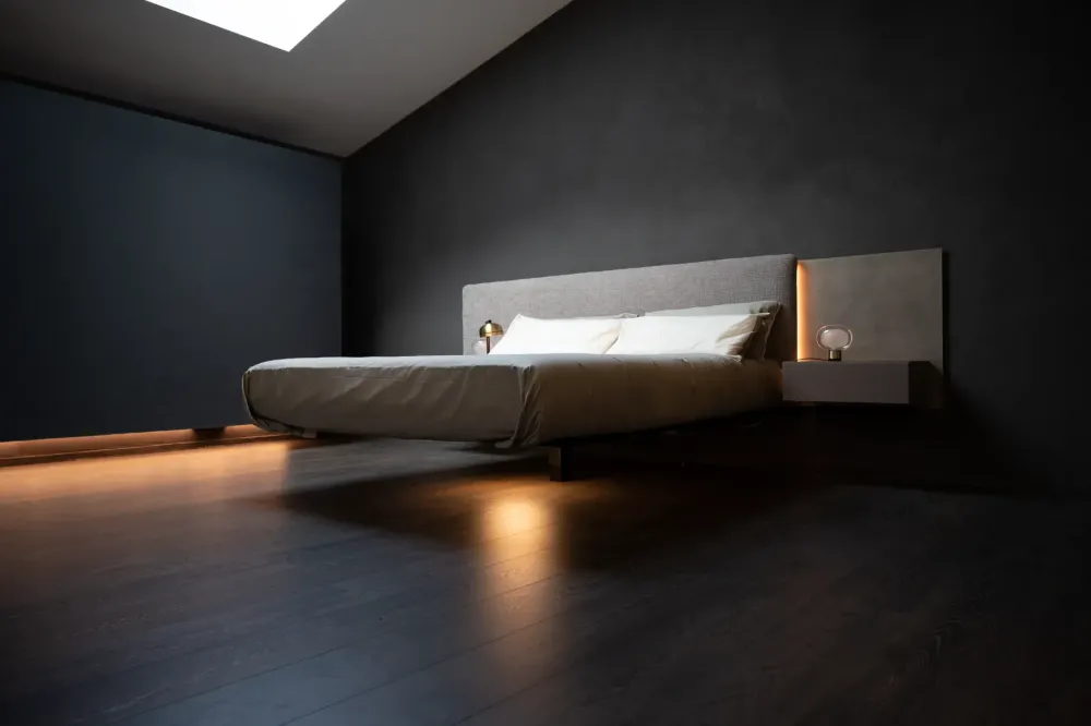 Gruppo notte composta da pianale completo di illuminazione sotto pianale per letto Fluttua per materasso da 160x200cm testata L.303 composta da pannello in tessuto fin.Axum col.3 e pannello in vetro fin.X-Glass opaco titanio completo di n.02 comodini sospesi L.55,2×18,4×40,6 con frontale vetro lucido fango e struttura laccato fango.