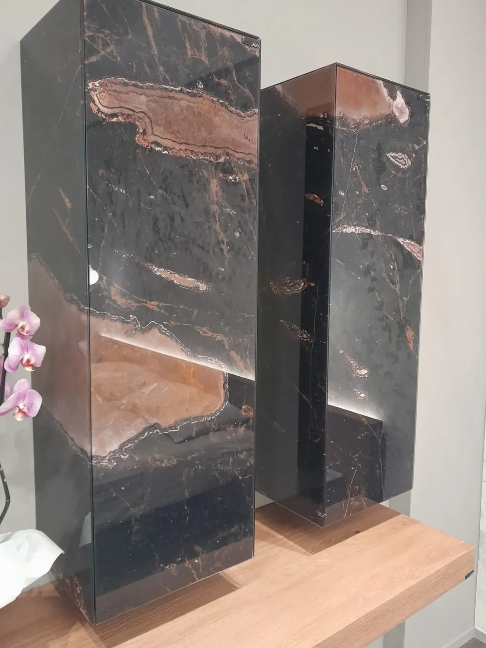 Bagno lago con mensola in wildwood 220cm , compreso di miscelatore e sifone + 2 mobili pensili in xglass lucido colore geode cm 110×37