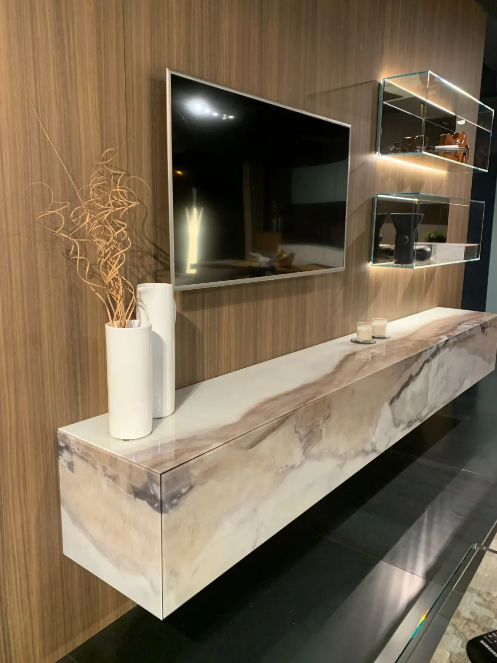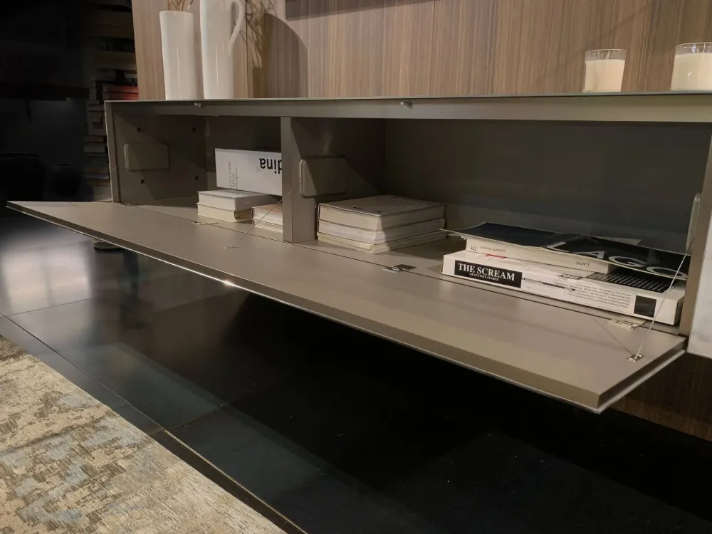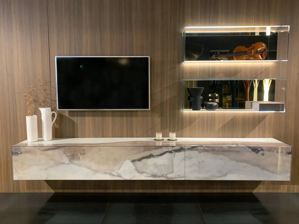 Per impreziosire un soggiorno moderni scegli una parete attrezzata che mantenga una certa coerenza stilistica, come questo modello Materia 36e8 + glass storage a prezzo ribassato.