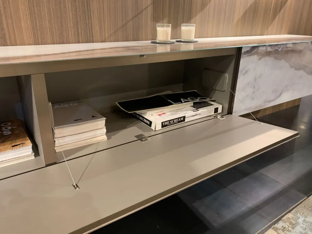 La parete attrezzata modello Materia 36e8 + glass storage nell’immagine saprà impreziosire il tuo soggiorno sottolineando le doti estetiche dell’ambiente: che tu desideri riporci riviste, oggetti d’uso tipicamente decorativo o la televisione, questo mobile ti assicurerà tutta la qualità del marchio Lago a prezzi imbattibili.