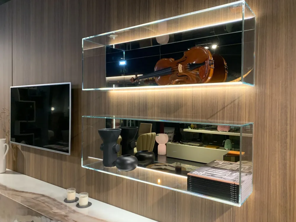 Per il tuo soggiorno abbiamo pensato ad una serie di mobili ed elementi accessori in vetro, come la parete attrezzata Materia 36e8 + glass storage scontata, ideale per congiungere doti di praticità e design nel tuo soggiorno.