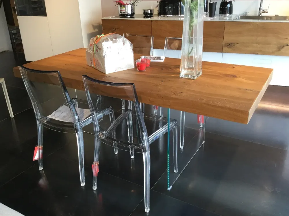 Il tavolo in offerta, modello Air Wildwood di Lago, è un tavolo rettangolare ad effetto “sospeso”. Air ha infatti due gambe in vetro extrachiaro temperato trasparente, spessore 1,2 cm, che sembrano invisibili. Tale caratteristica da la sensazione che il piano stia fluttuando nella stanza. Il piano, spessore 8 cm, è in Wildwood Naturale, particolare finitura di Lago data da un legno rovere centenario sottoposto a termotrattamento per una maggiore resistenza. Al tatto, il piano presenta le venature del legno e trasforma l’oggetto in una esperienza sensoriale.