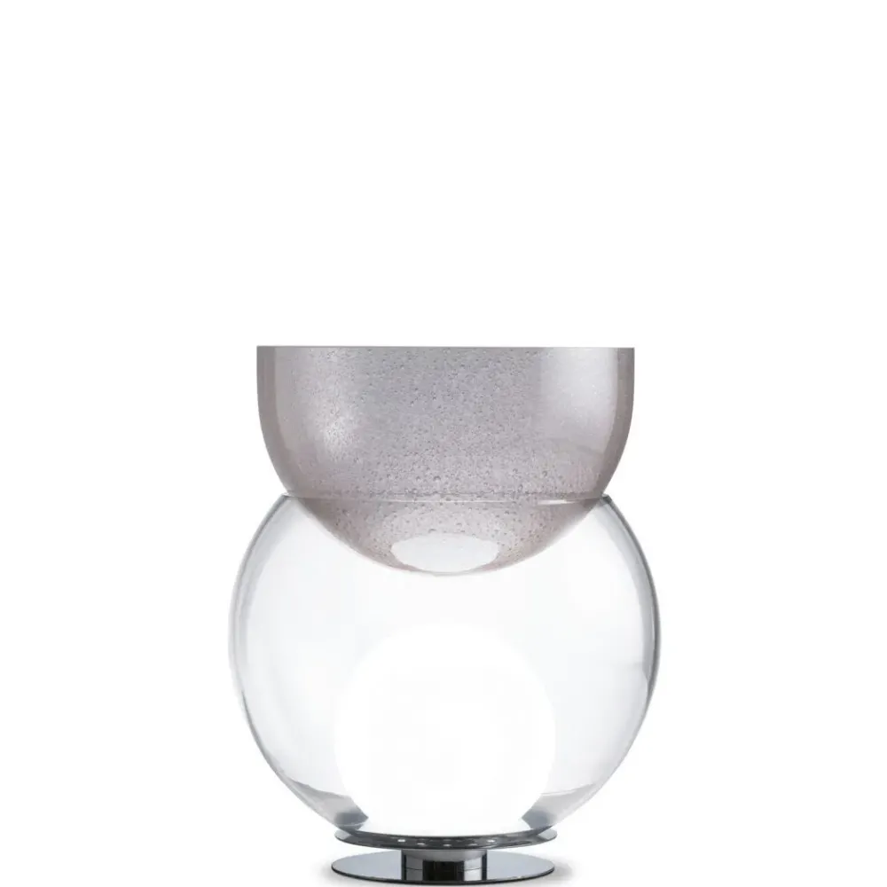 Lampada da tavolo a luce diffusa non dimmerabile. Montatura in metallo cromato. Sfera centrale in vetro soffiato trasparente. Sfera interna in vetro soffiato bianco lucido. Semisfera superiore in vetro soffiato pulegoso trasparente colorato. Cavo di alimentazione, interruttore e spina neri. Spina europea due poli. Fonte luminosa non inclusa.