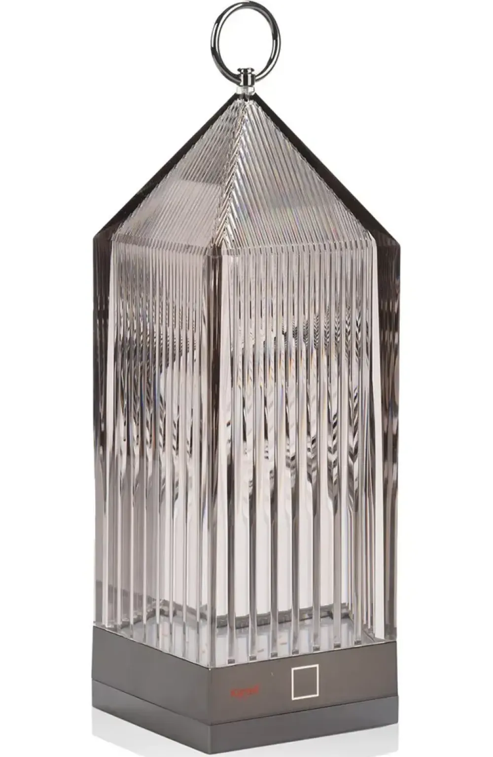 Disponibile in versione Cristallo o Fumè. Lantern è un originale lampada a led portatile, una lanterna ricaricabile trasparente, stampata a iniezione, che si ricarica appoggiandosi a una base conduttrice. La luce viene proiettata grazie a un effetto grafico del design.