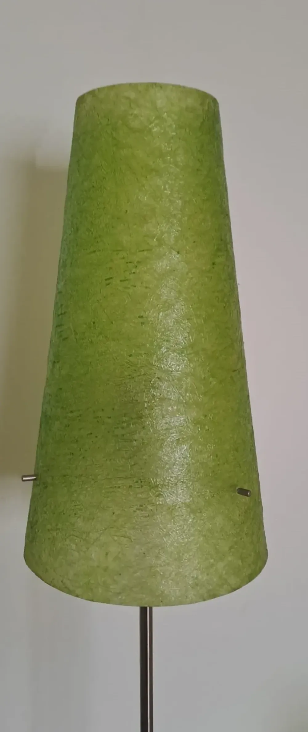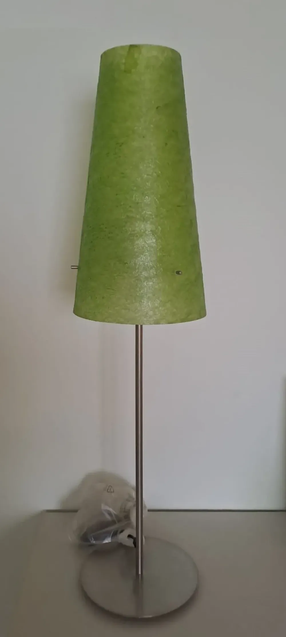 Lampada da tavolo con basamento in acciaio spazzolato e paralume in resina, H. 84 cm.