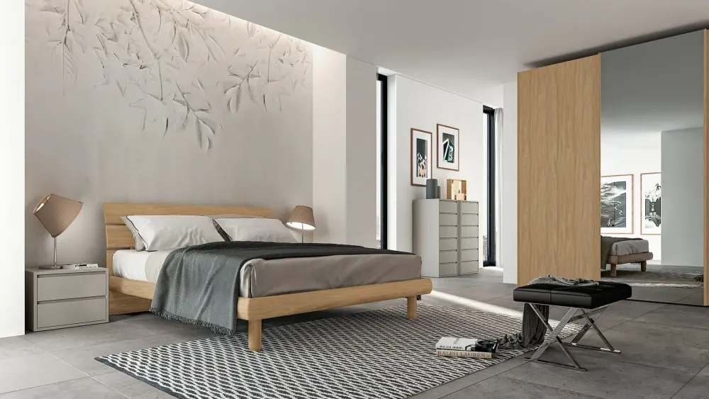 Teorema è un letto comodo e confortevole, dalle linee eleganti adatto ad abbellire qualsiasi camera da letto. La testiera a doghe di Teorema crea una struttura dinamica e leggera. Il giroletto condivide con il gruppo le linee tondeggianti.