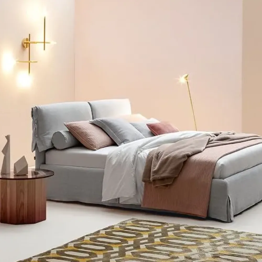 La testiera è avvolta da due grandi cuscini morbidi, trattenuti lateralmente da un ampia orlatura chiusa con bottoni rivestiti, che donano un tocco di classe e profondità visiva. A completare il look, una morbida gonna in tessuto sfiora delicatamente il pavimento, rifinita con due pinces decorative sugli angoli frontali che esaltano l armonia delle linee e regalano un atmosfera intima e sofisticata.
