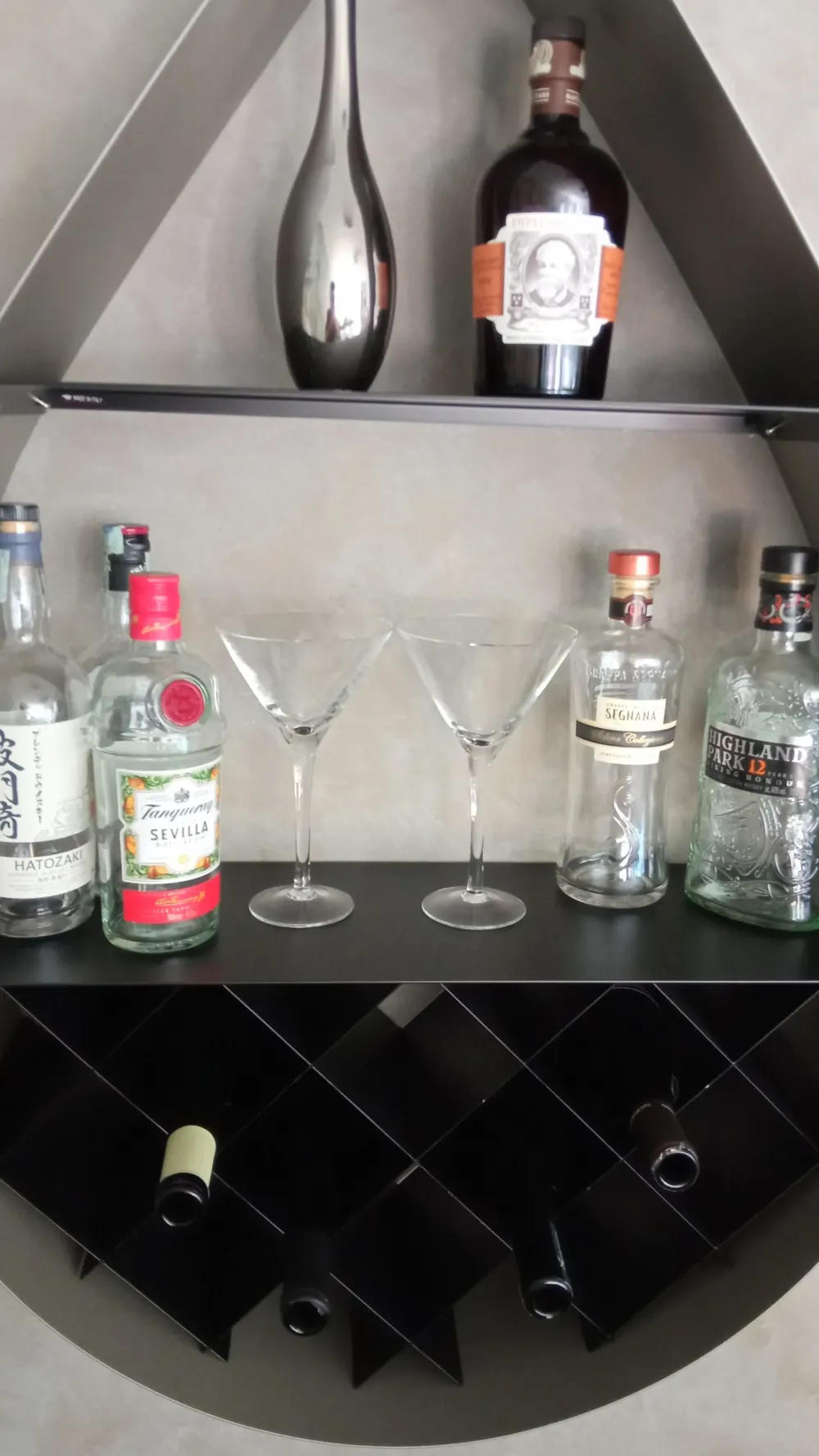 Libreria/portabottiglie a muro in acciaio verniciato goffrato titanio (GFM11) con griglia e ripiano verniciati nero (OP17) opaco.