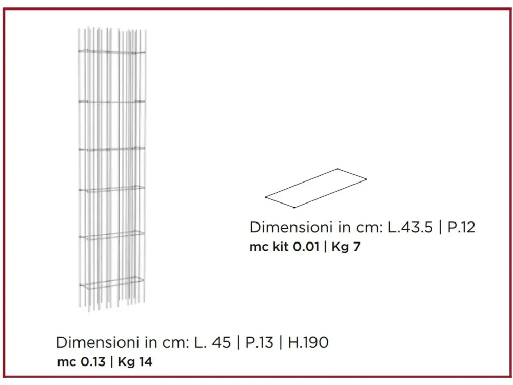 Metrica è la libreria del tuo living, ma anche il sistema espositivo del tuo negozio di accessori, o il luogo in cui riporre le bottiglie pregiate del tuo lounge bar. Metrica è perfetta per la tua casa e il contract. La struttura semplice sfrutta la lavorazione industriale del tondino cadenzato in differenti diametri e secondo una partizione irregolare. Il volume essenziale si delinea grazie all’incontro di linee rette: il ritmo è scandito dalle bacchette posizionate ad intervalli diversi su una struttura apertamente rigorosa entro la quale i libri e gli oggetti inseriti ne completano la forma scrivendo di volta in volta nuove composizioni.