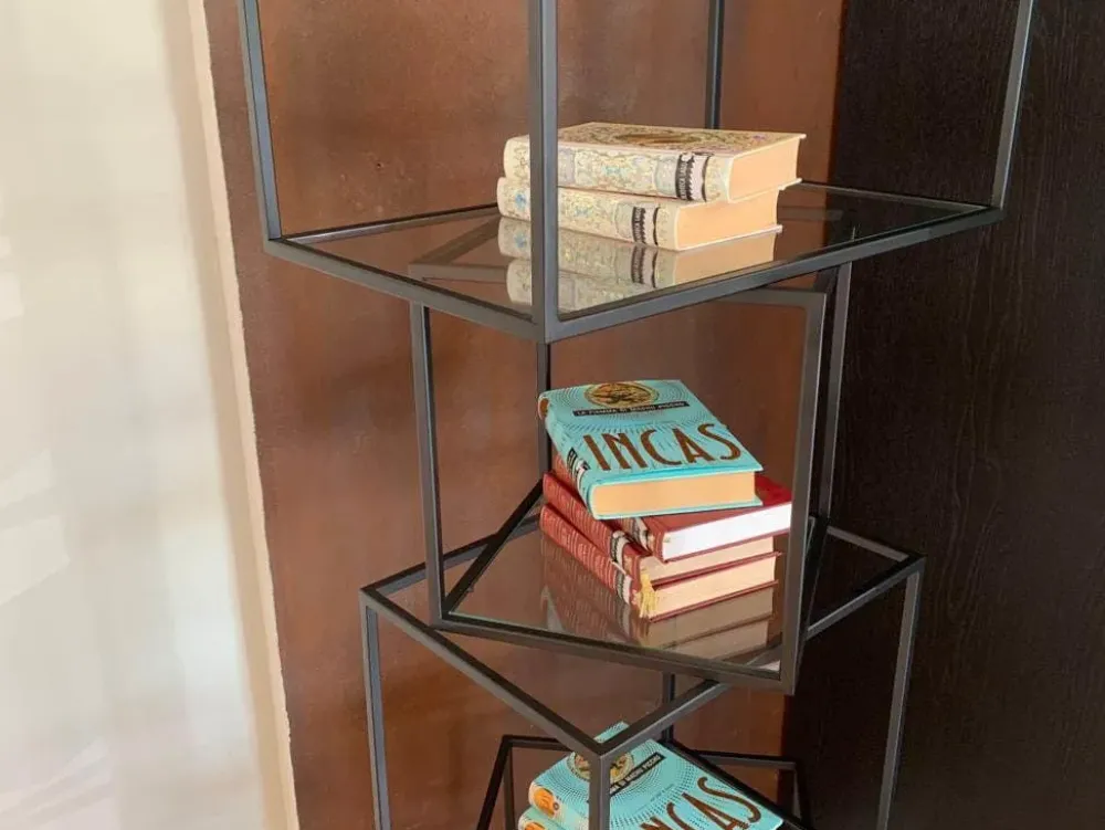 Completo di ripiani in cristallo. Realizzato con linee semplici e leggere per esporre oggetti e libri di pregio , si adatta in ogni ambiente della casa.