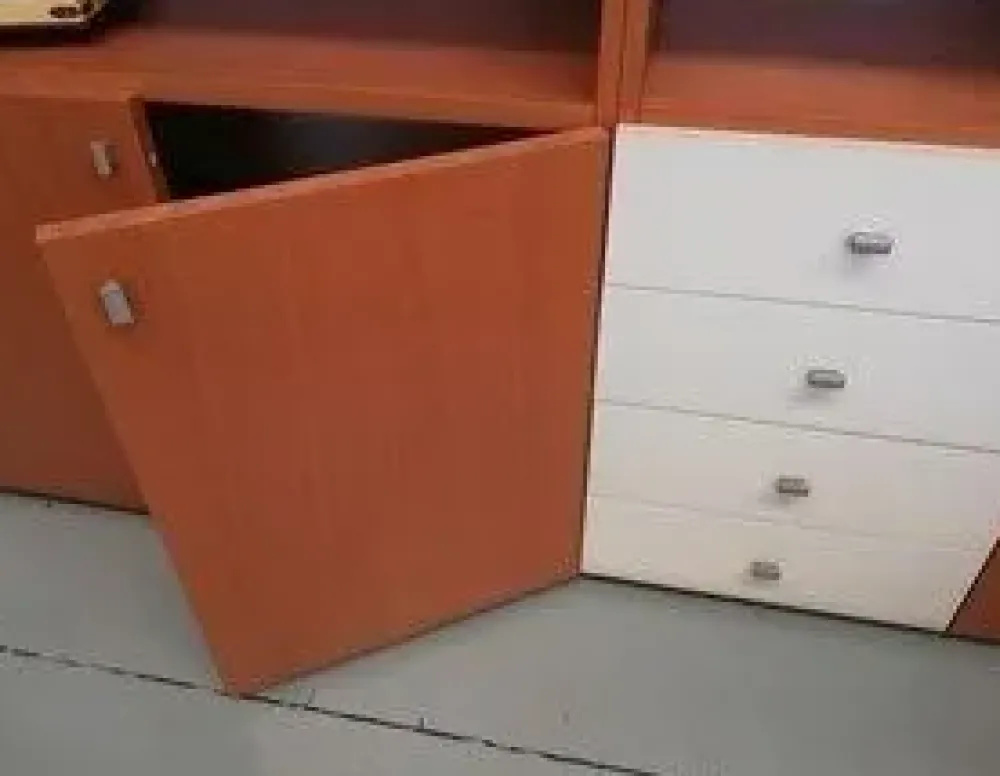 Libreria moderna componibile vero legno ” di LINEA IN ARREDAMENTI a 4 ante + cassettiera esterna con 4 cassetti e vani a giorno, scrivania sagomata da appoggio e sedia con ruote. La libreria come si può vedere dalle foto è possibile inserirla in una cameretta con la scrivania sempre utile, tolta la scrivania la libreria arreda anche un soggiorno o un ingresso. Scheda informativa del prodotto di Qualita` MADE IN ITALY e caratteristiche principali Libreria – struttura libreria in legno impiallacciato faggio – pannellatura retro in legno laccato goffrato antigraffio, finitura bianco – cassettiera con 4 cassetti in legno laccato goffrato antigraffio, finitura bianco – apertura ante/cassetti con maniglia alluminio satinato – cassetti con guide metalliche – ripiani a giorno sp. cm 2,5 – 3 ripiani interni spostabili – misure: L. cm 240 x P. 47 x H. 226 Scrivania – struttura sagomata sp. cm 3 con angolo stondato, in legno laccato goffrato antigraffio – finitura bianco con gamba di appoggio in metallo – misure L. cm 180 x P. 44/70 Sedia con ruote in legno laccato goffrato antigraffio, finitura azzurro
