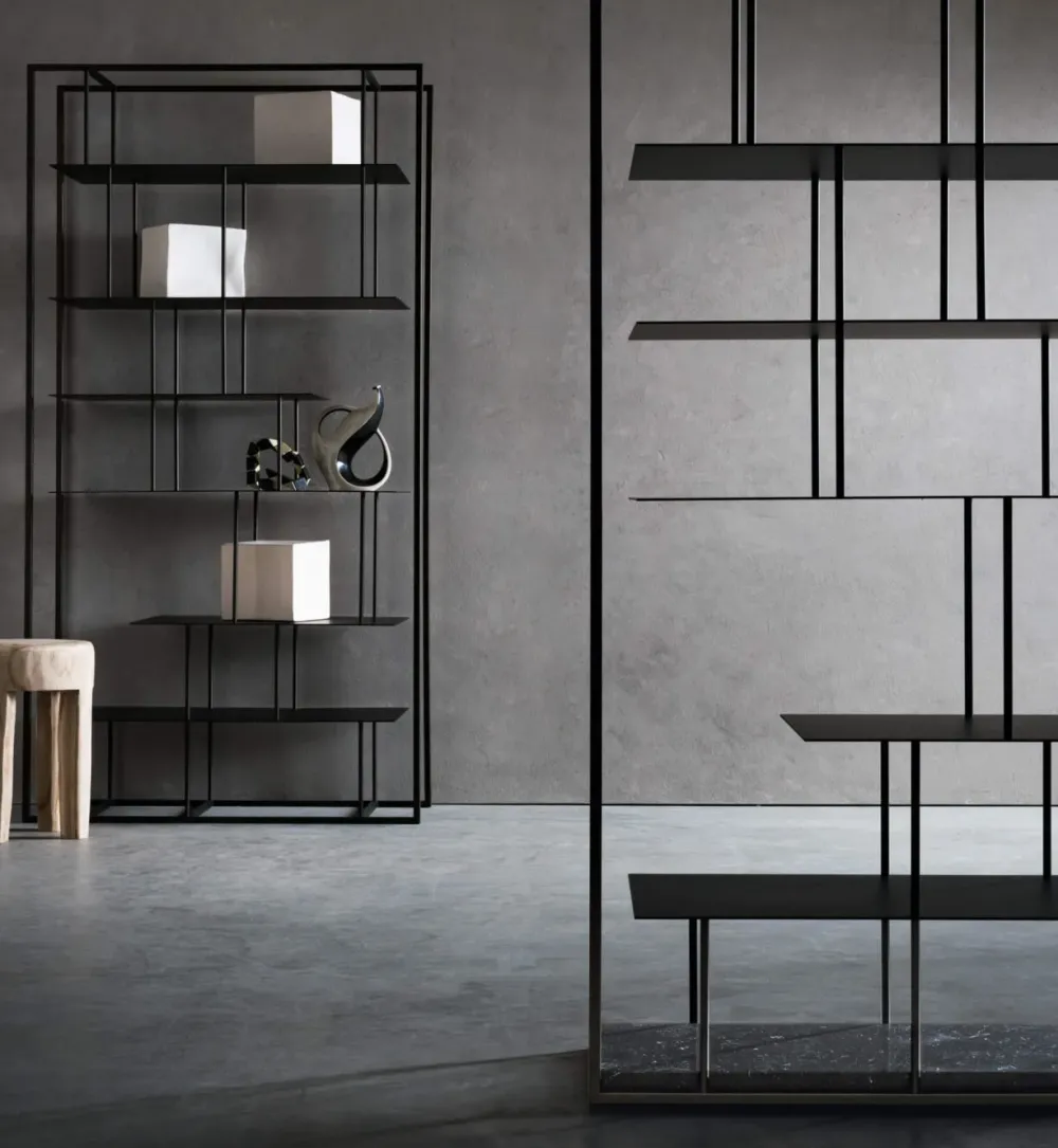 Libreria TOWER in metallo finitura antracite, disponibile nella versione a parete o freestanding con basamento in marmo antiribaltamento.