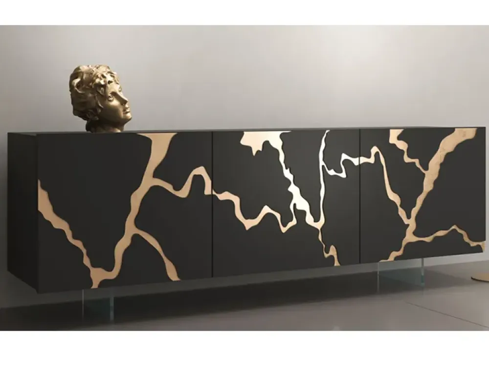 - Forme decise e materiali durevoli: scopri la madia in laminato materico qui visibile e potrai impreziosire il living.