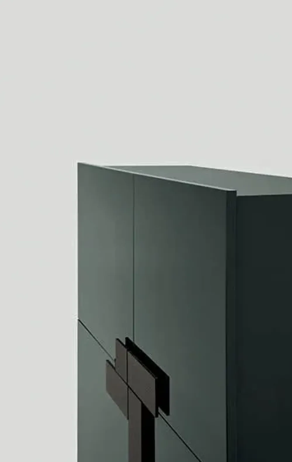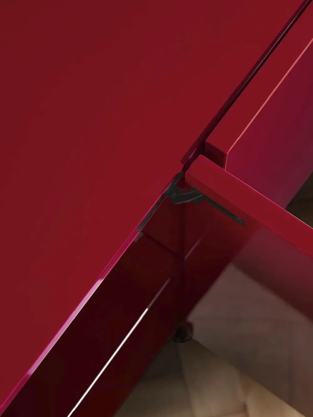 Le ante della madia Ginevra sono incardinate su cerniere a scomparsa rallentate (anta battente) oppure su cerniere piatte con cavetto in acciaio frizionato in chiusura (anta ribalta) e sporgono rispetto alla struttura, realizzata con pannelli sp.1,8 cm tagliati a 45° e giuntati.